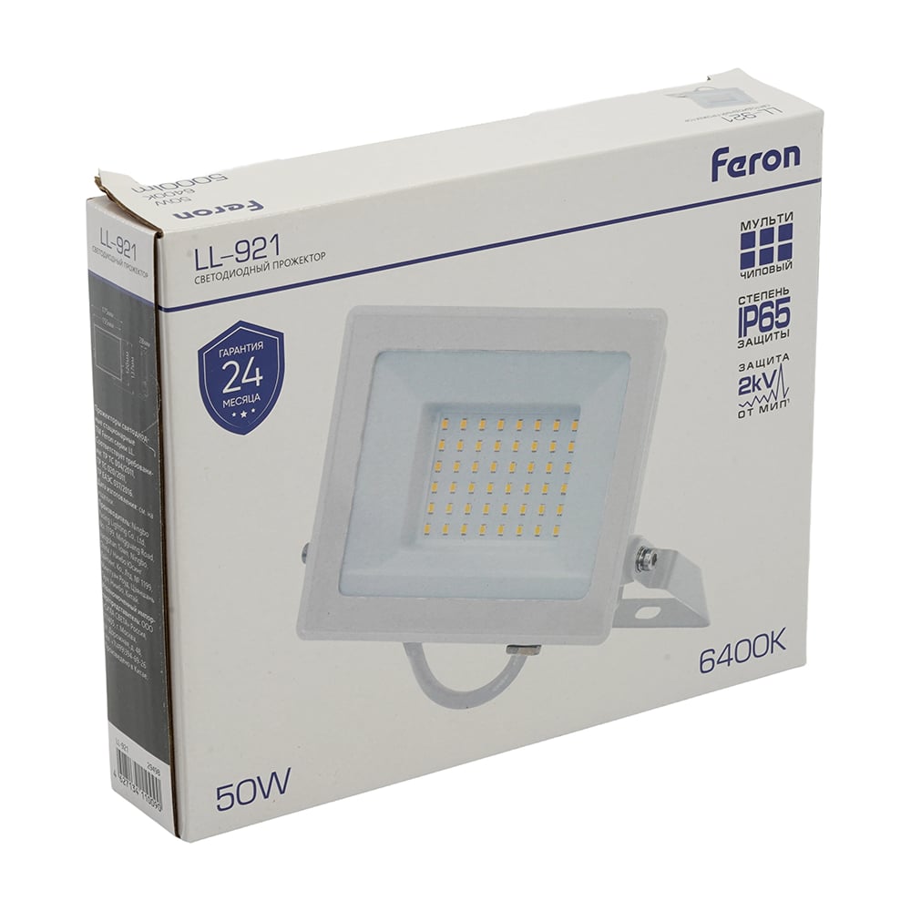 Светодиодный прожектор FERON LL-921 2835 SMD, 50W, 6400K, IP65, белый, с матовым стеклом 29498
