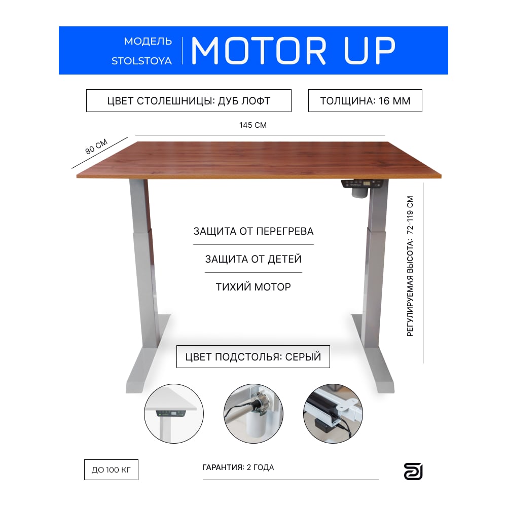 Стол с регулируемой высотой StolStoya МОТОР UP рама серая, столешница ЛДСП, Дуб лофт, 145x80 PE211ISSLDL145