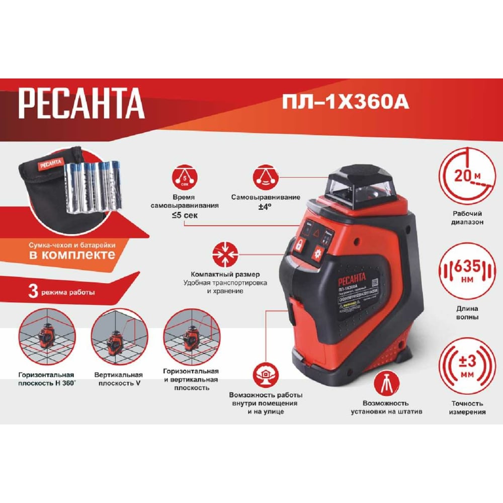 | Направление лучей | горизонталь 360 град./вертикаль/крест |