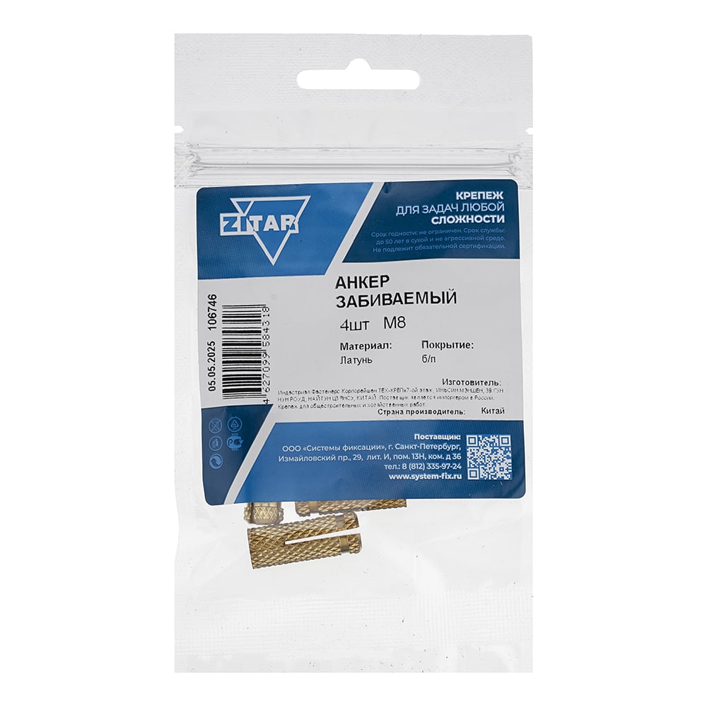 Забиваемый латунный анкер М8, 4 шт, пакет Zitar 106746