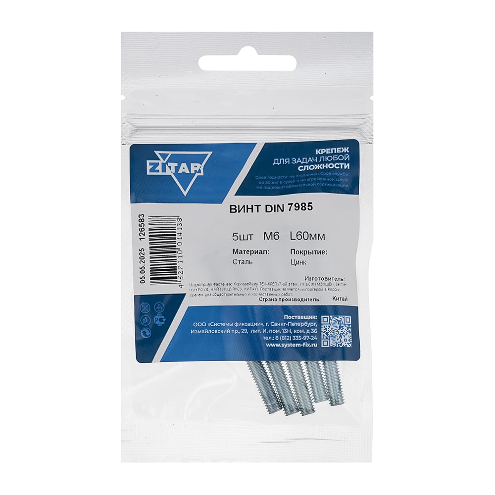 Винт Zitar DIN7985 с полукруглой головкой оцинкованный М6x60, 5 шт. (пакет) 126583