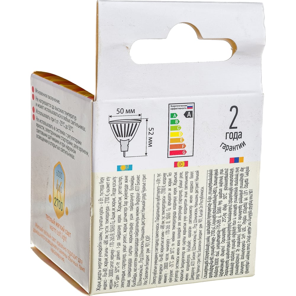 Длина 50 мм Вид FR/матированная Тип светодиодная Цоколь GU5.3 Цветность теплый белый (менее 3300 К) Диаметр 50 мм Форма софитная Цветовая температура 2700 К Назначение декоративная Количество в упаковке 1 шт Световой поток 480 Лм Цветопередача 80 Ra Тип колбы MR16 Напряжение 220 В Эквивалент лампы накаливания 50 Вт Срок службы 30000 ч Мощность (Вт) 6 Датчик движения нет Диапазон рабочих температур от -25 до +50 °С Датчик освещенности нет Угол рассеивания 100 град Регулировка яркости светового потока нет Световая отдача 80 Лм/Вт Наличие аккумулятора нет