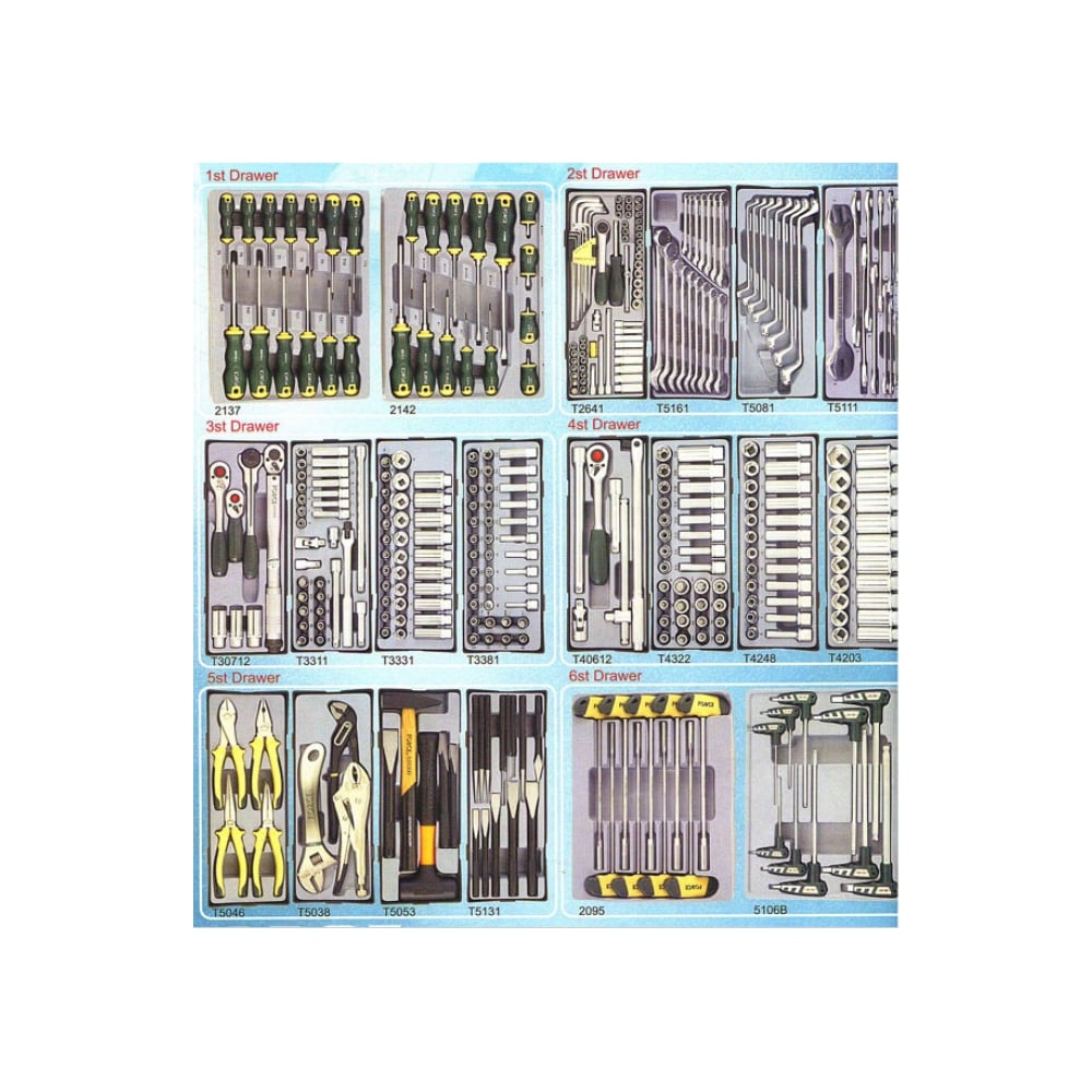 Высота 1050 мм Длина 800 мм Ширина 500 мм Цвет красный Количество полок 5 Количество ящиков 2 Количество предметов 361 Система хранения ящик Инструмент в комплекте есть