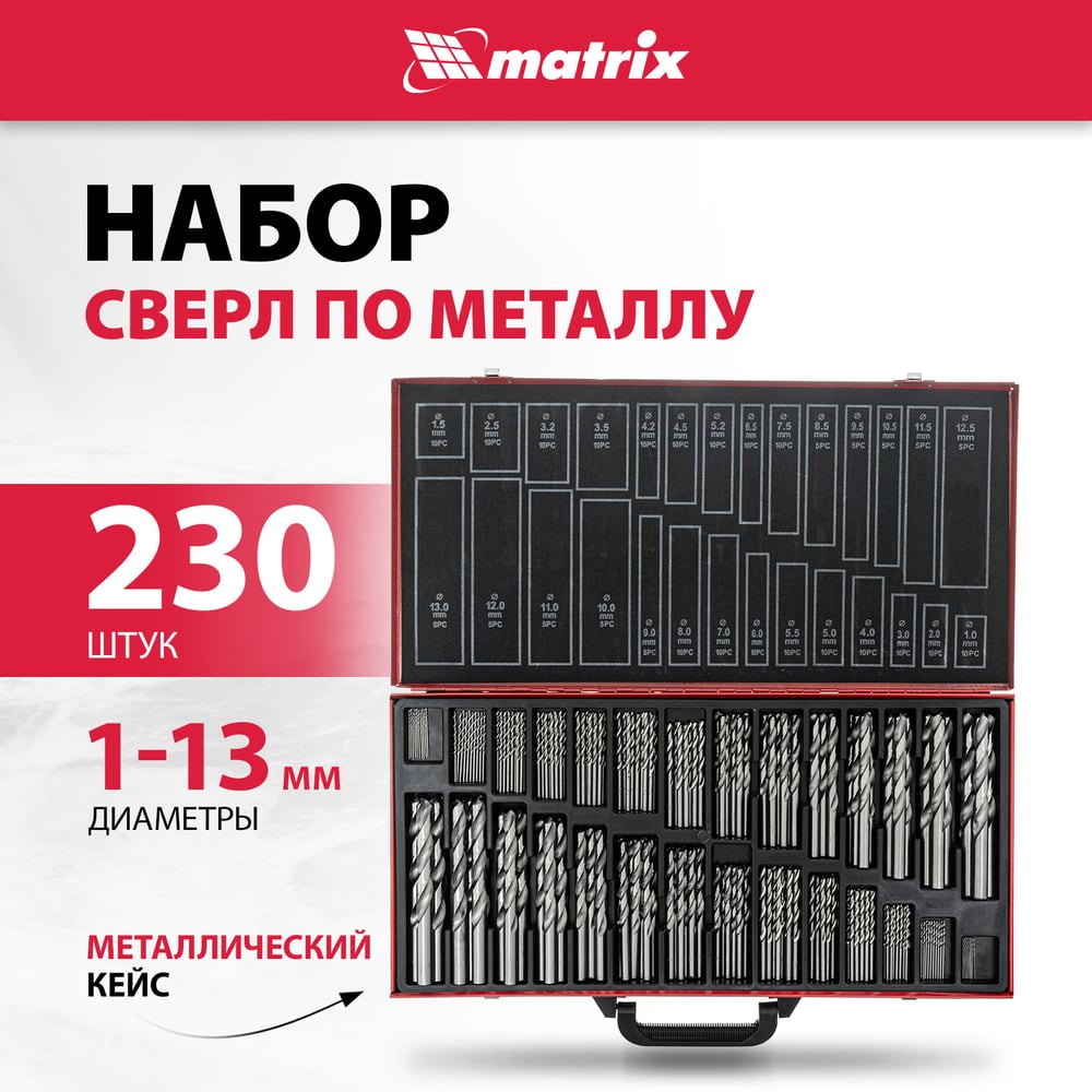 Набор сверл по металлу в металлическом кейсе (230 шт; 1-13 мм; HSS) MATRIX 723230