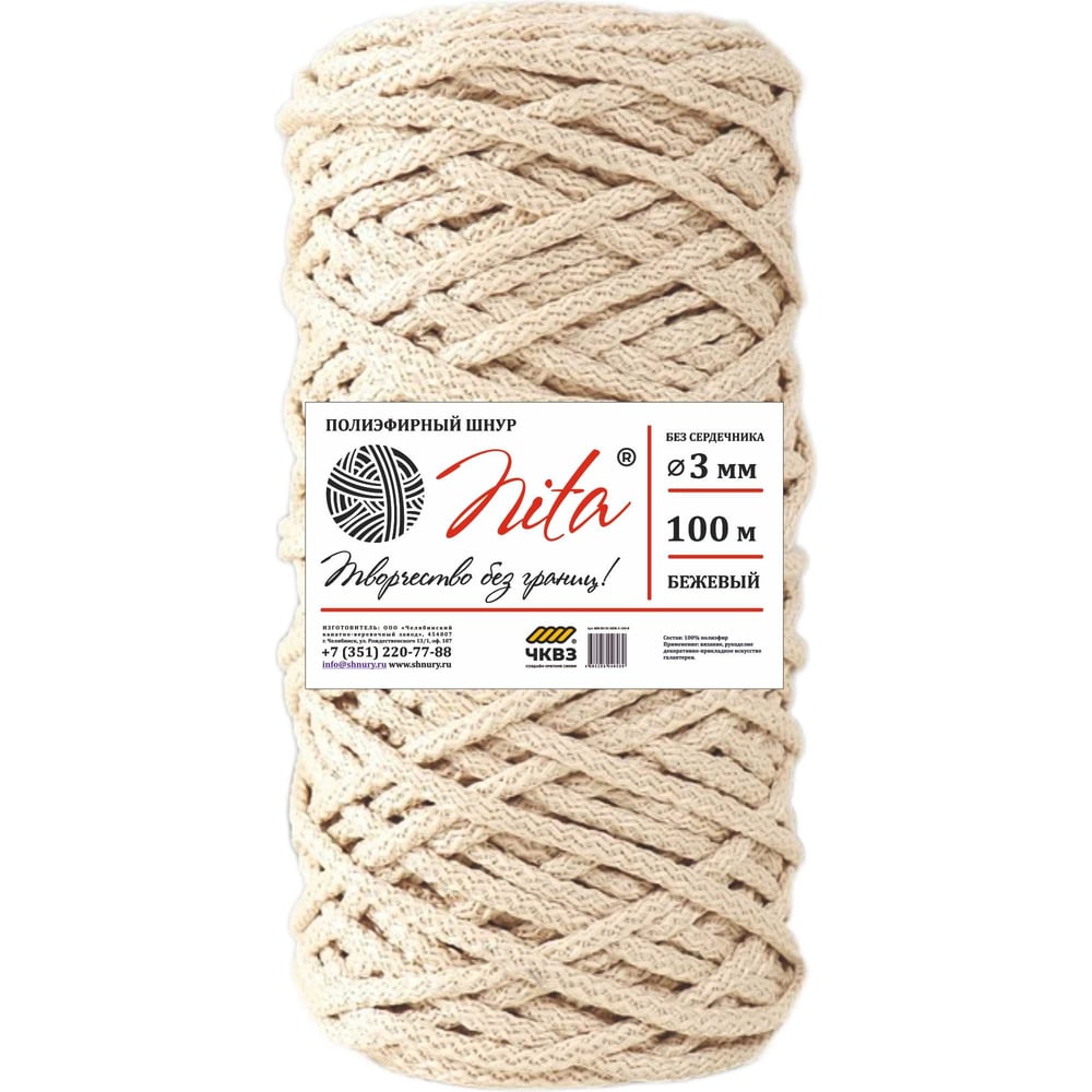 Вязаный шнур Nita без сердечника, полиэфир, d=3 мм, 100 м, бежевый, 6" 4680253046039
