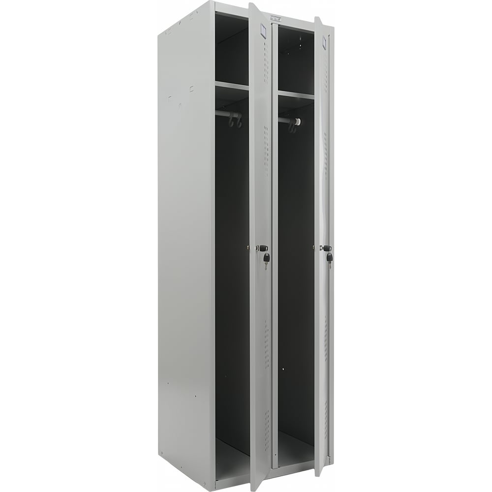 Габариты без упаковки 1860х600х500 мм Высота 1860 мм Материал сталь Ширина 600 мм Цвет серый Тип гардеробный Класс товара Бытовой Тип установки напольные Выдвижные ящики нет Количество дверей 2 Количество полок 2 Количество отделений 2 Глубина 500 мм Тип замка ключевой Встроенное отделение нет Внутренние габариты 1776х311/285х468 мм Тип двери распашная