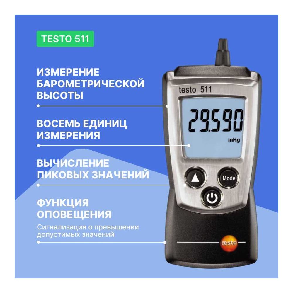 | Единицы измерения | гПа, мбар, Па, ммН2О, ммНg, дюймН2О, дюймНg, фунт на кв.дюйм, м, фут |
