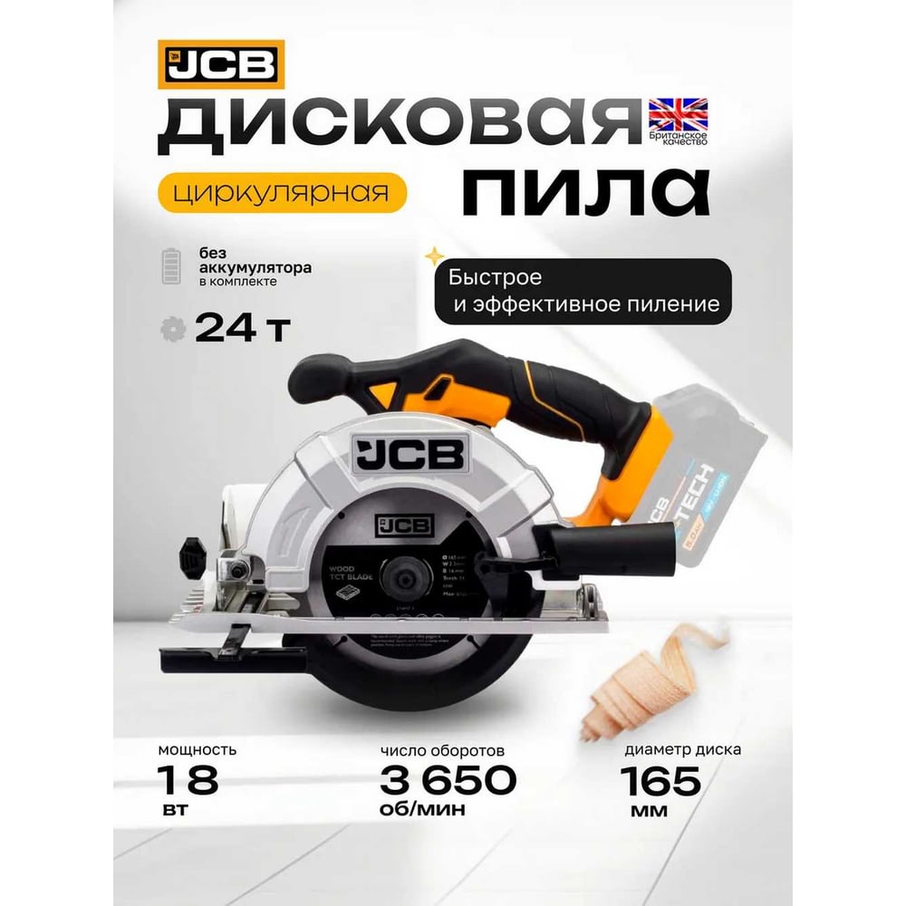 Пила циркулярная JCB аккумуляторная 18V, 3650 об/мин, диаметр диска 165 мм, без аккумулятора JCB-18CS-B-E(57253)
