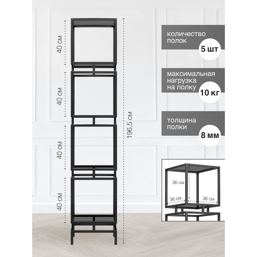 Стеллаж GreenWeen CUBIC-4, черный каркас, полки тонированное стекло, 1965x400x400 GW-CUBIC-4-B-G