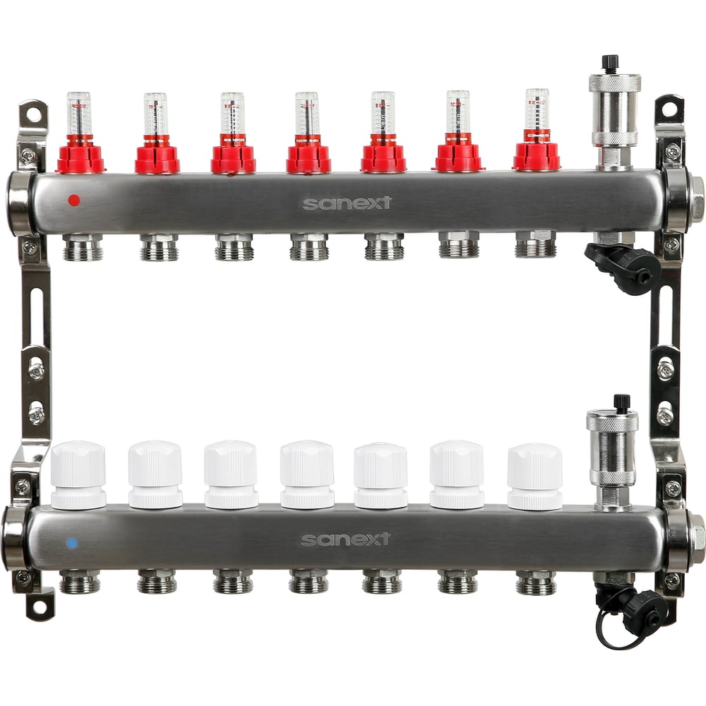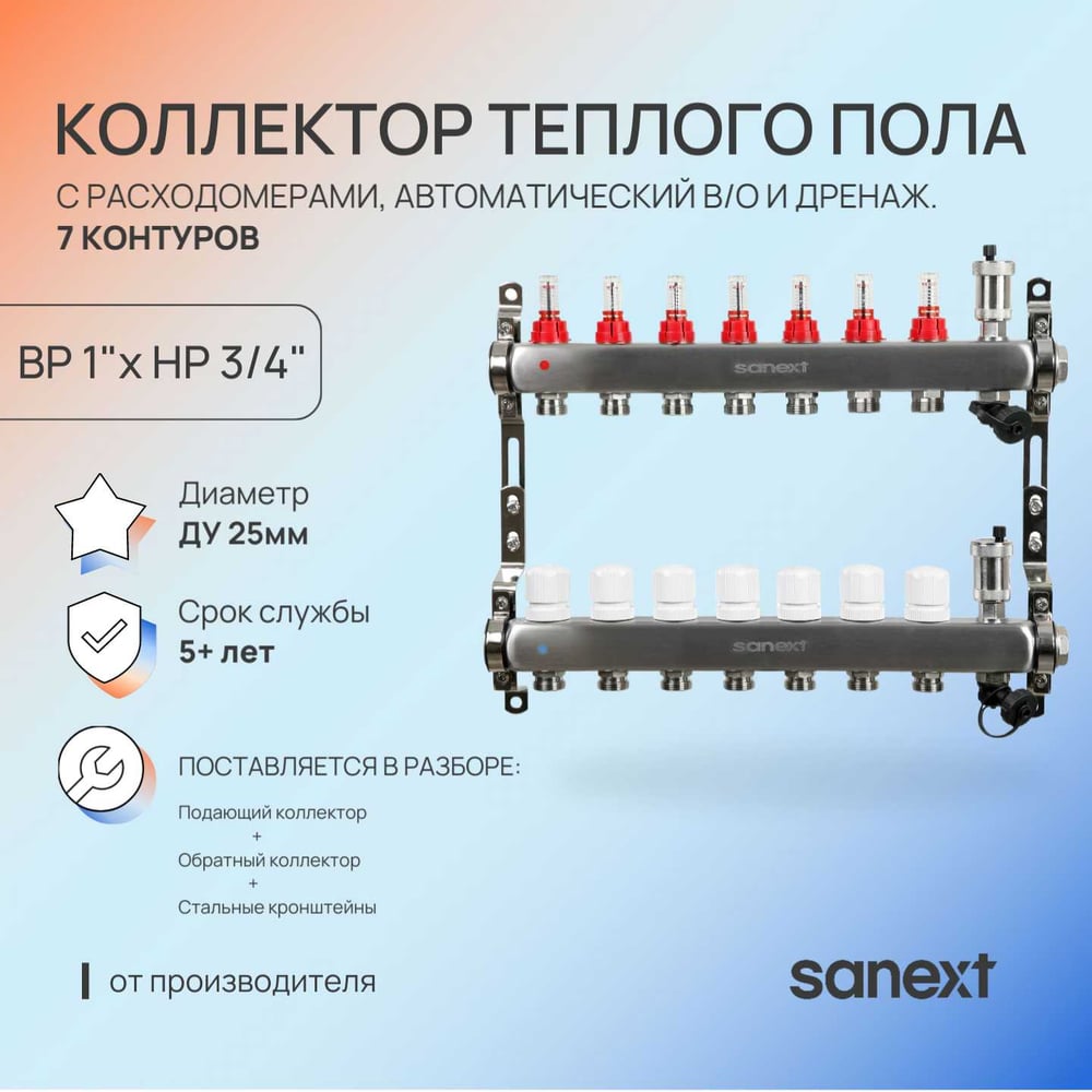Коллектор для теплого пола SANEXT с расходомерами, автоматический в/о и дренаж., ДУ25, ВР1"х 7 контуров НР 3/4" 8527-1