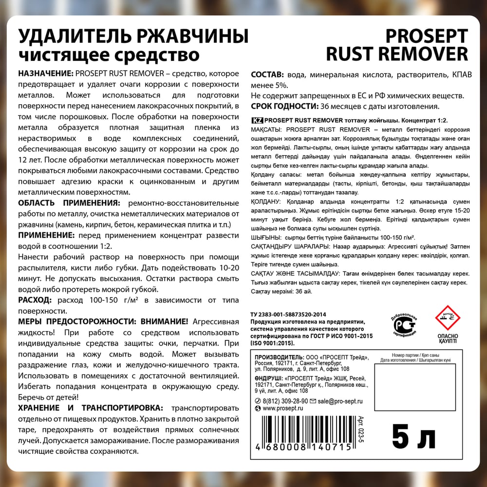 Удалитель ржавчины PROSEPT RUST remover, 5л, концентрат 1:2, 023-5