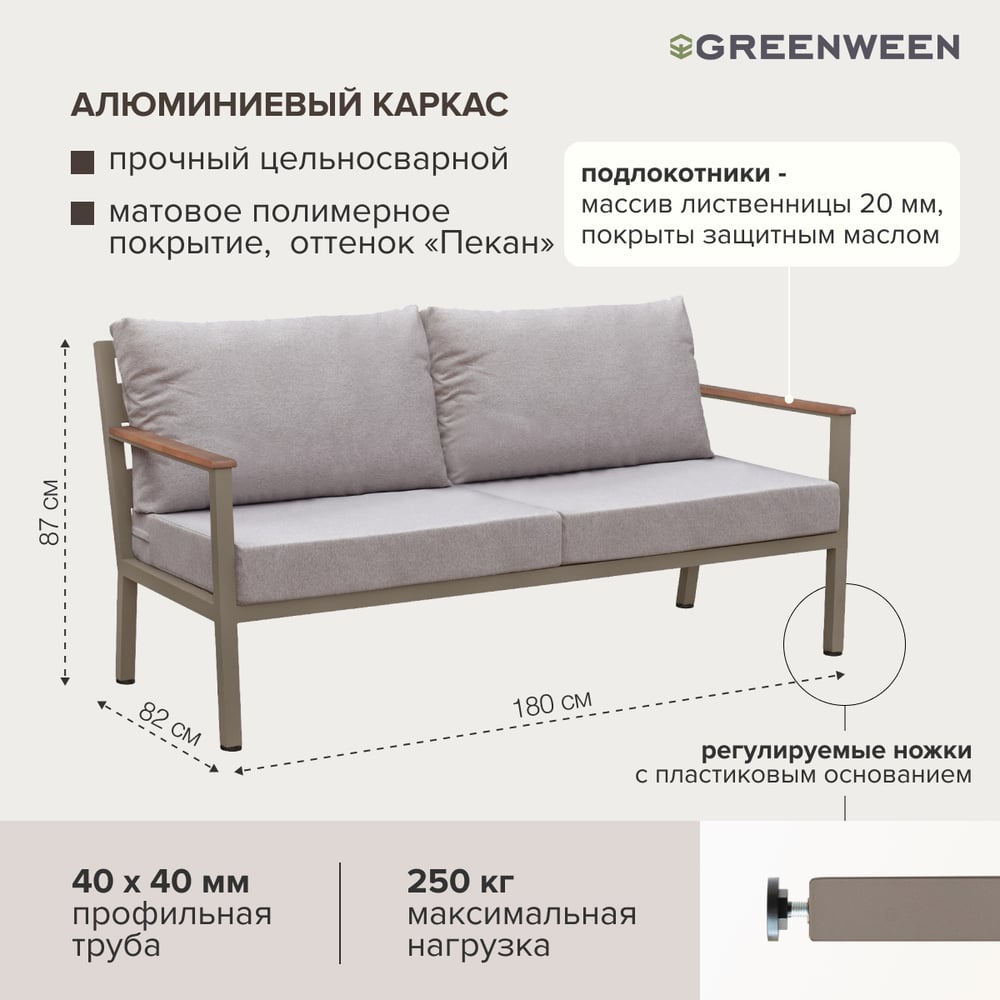 Уличный диван GreenWeen SANTORINI, каркас цвет PECAN, подушки рогожка цвет BAHAMA ASH, подлокотники дерево GW-AL-SANT-SOFA-1800P
