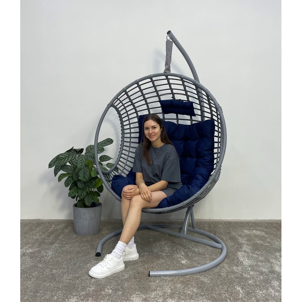 Подвесное кресло-кокон Лаура FLATA серый + каркас, подушка синяя FLT-210