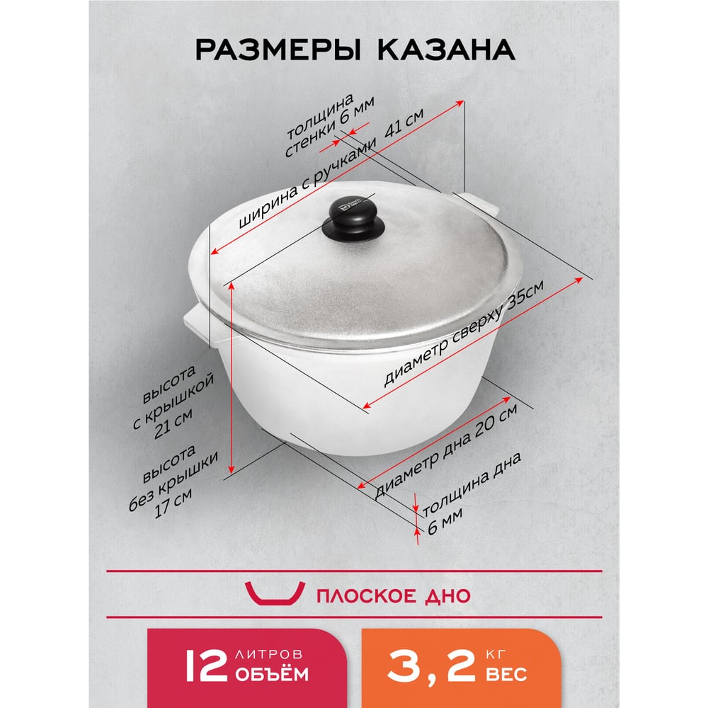 Казан алюминиевый Davr Metall 12 литров, плоское дно, с крышкой казан12(ал)