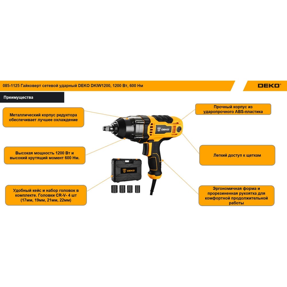Гайковерт сетевой ударный DEKO DKIW1200, 1200 Вт, 600 Нм 085-1125