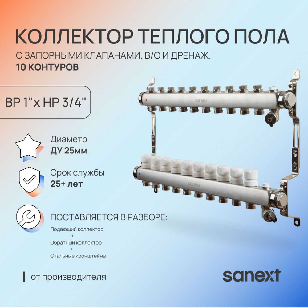 Коллектор для теплого пола SANEXT с запорной функцией, в/о и дренаж, ДУ25, ВР1"х 10 контуров НР 3/4" 85910