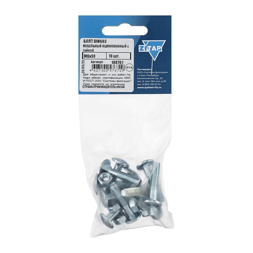 Мебельный болт DIN603 оцинкованный М6х30 с гайкой, 10 шт Zitar 108761