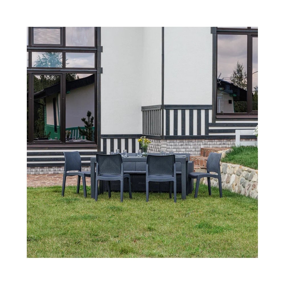 Покрытие порошковая краска Материал корпуса полипропилен Цвет корпуса графит Назначение для дачи и сада Количество предметов 6 Max нагрузка 120 кг Материал обивки нет Форма столешницы прямоугольник Материал столешницы полипропилен Складная конструкция нет Водонепроницаемость да Высота стола 750 мм Мягкое сиденье да Цвет обивки нет Состав комплекта стол, кресла, диван