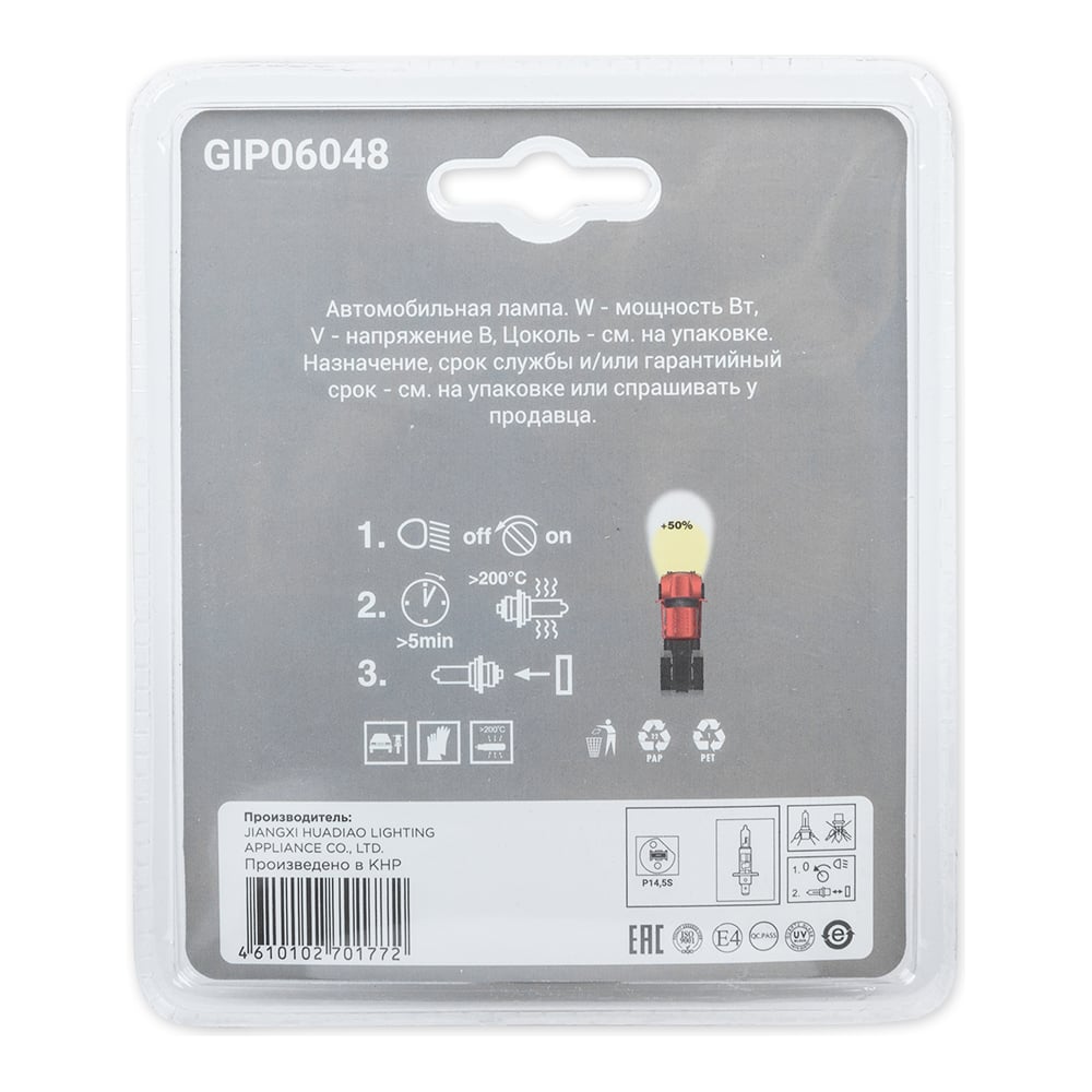 Лампа GANZ 12V H1 100W +50% P14,5s 5000K 2 шт. блистер GIP06048