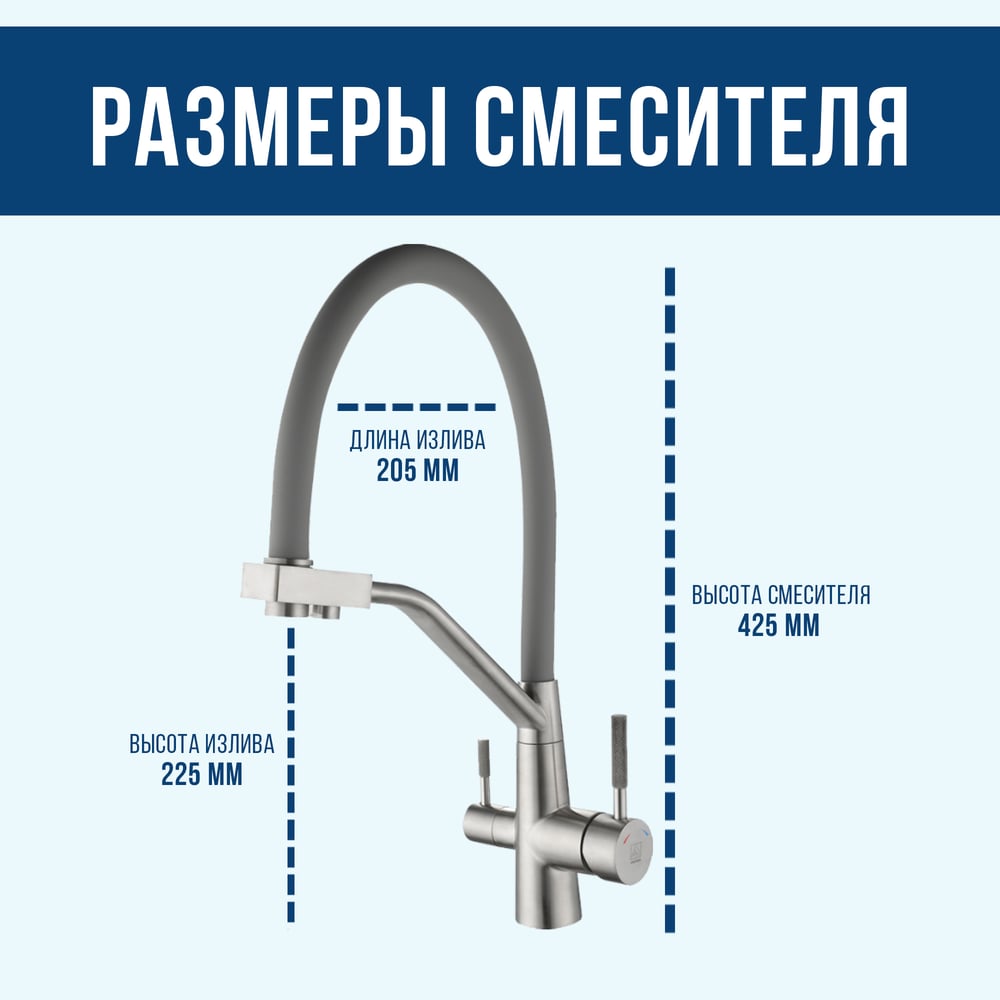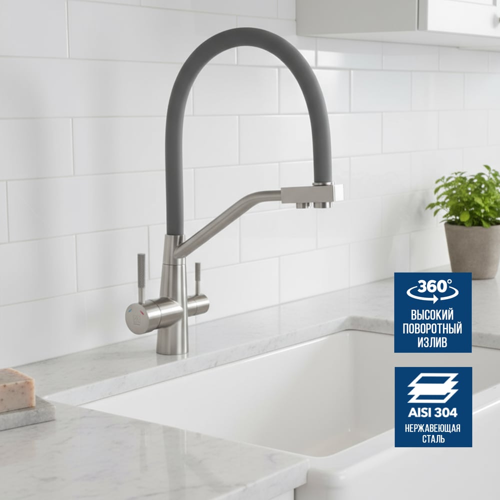 Смеситель для кухни ARGOTECH СОЛИД \ SOLID под питьевую воду, пластичный излив, серый, d-35, нерж. сталь 43978
