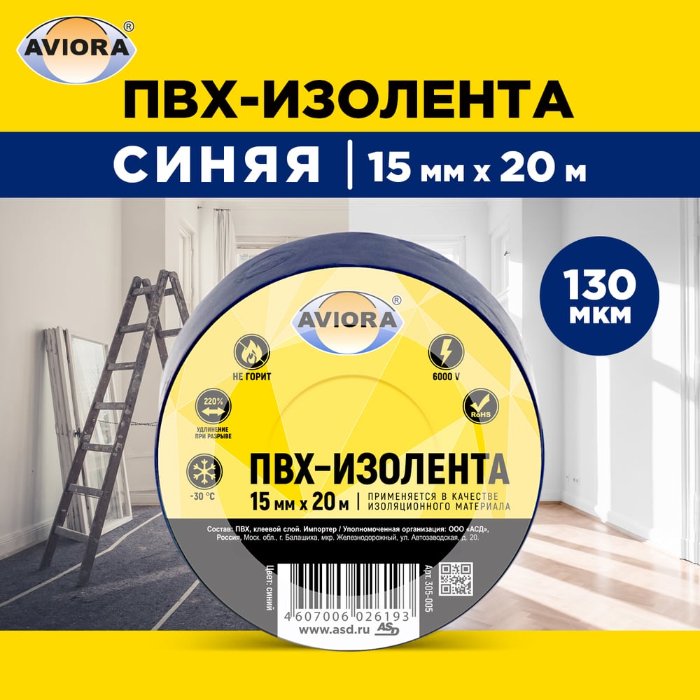 Изолента AVIORA ПВХ, 15 мм, 20 м, синяя 305-005
