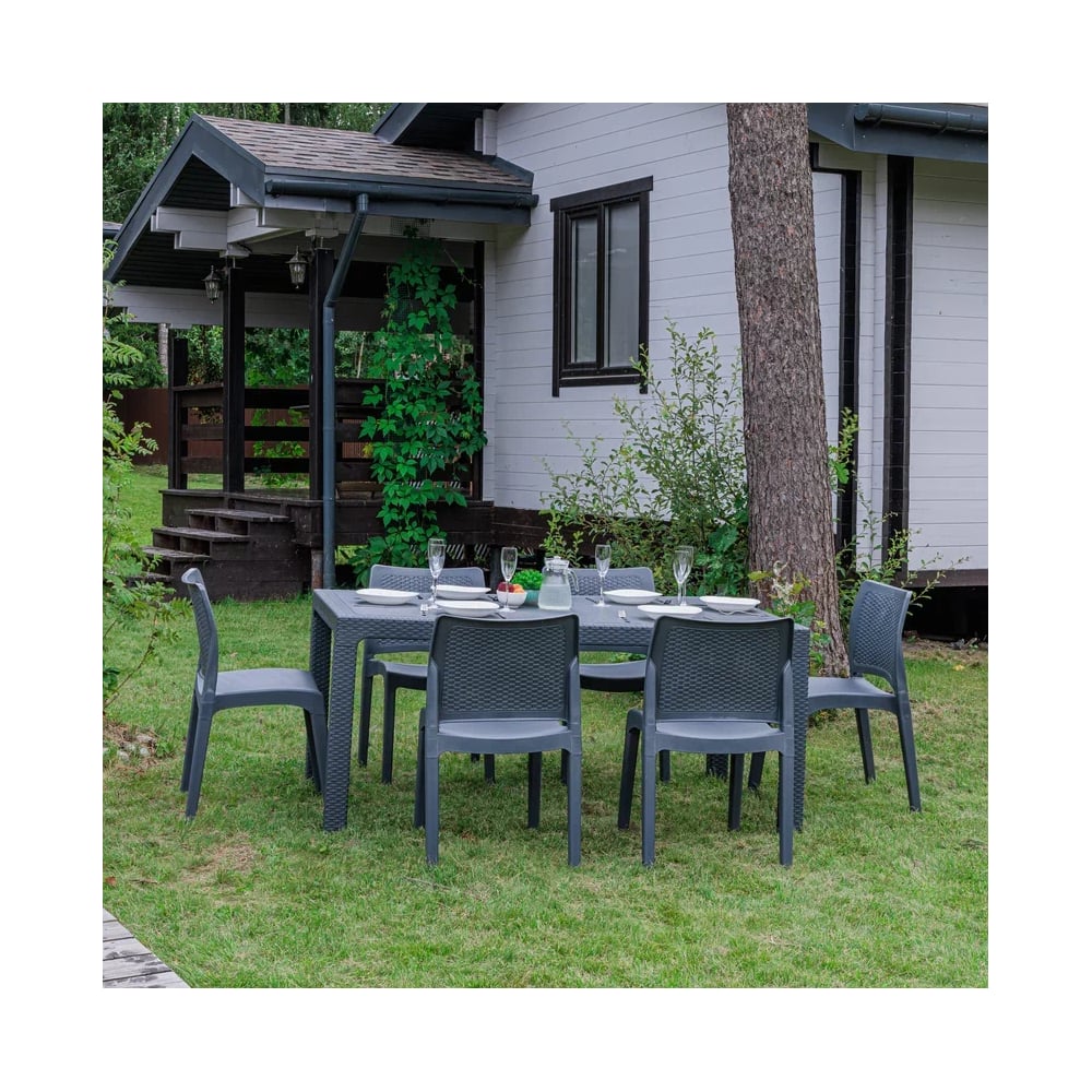 Покрытие порошковая краска Материал корпуса полипропилен Цвет корпуса графит Назначение для дачи и сада Количество предметов 7 Max нагрузка 120 кг Материал обивки нет Форма столешницы прямоугольник Материал столешницы полипропилен Складная конструкция нет Водонепроницаемость да Высота стола 750 мм Мягкое сиденье нет Цвет обивки нет Состав комплекта стол, стулья