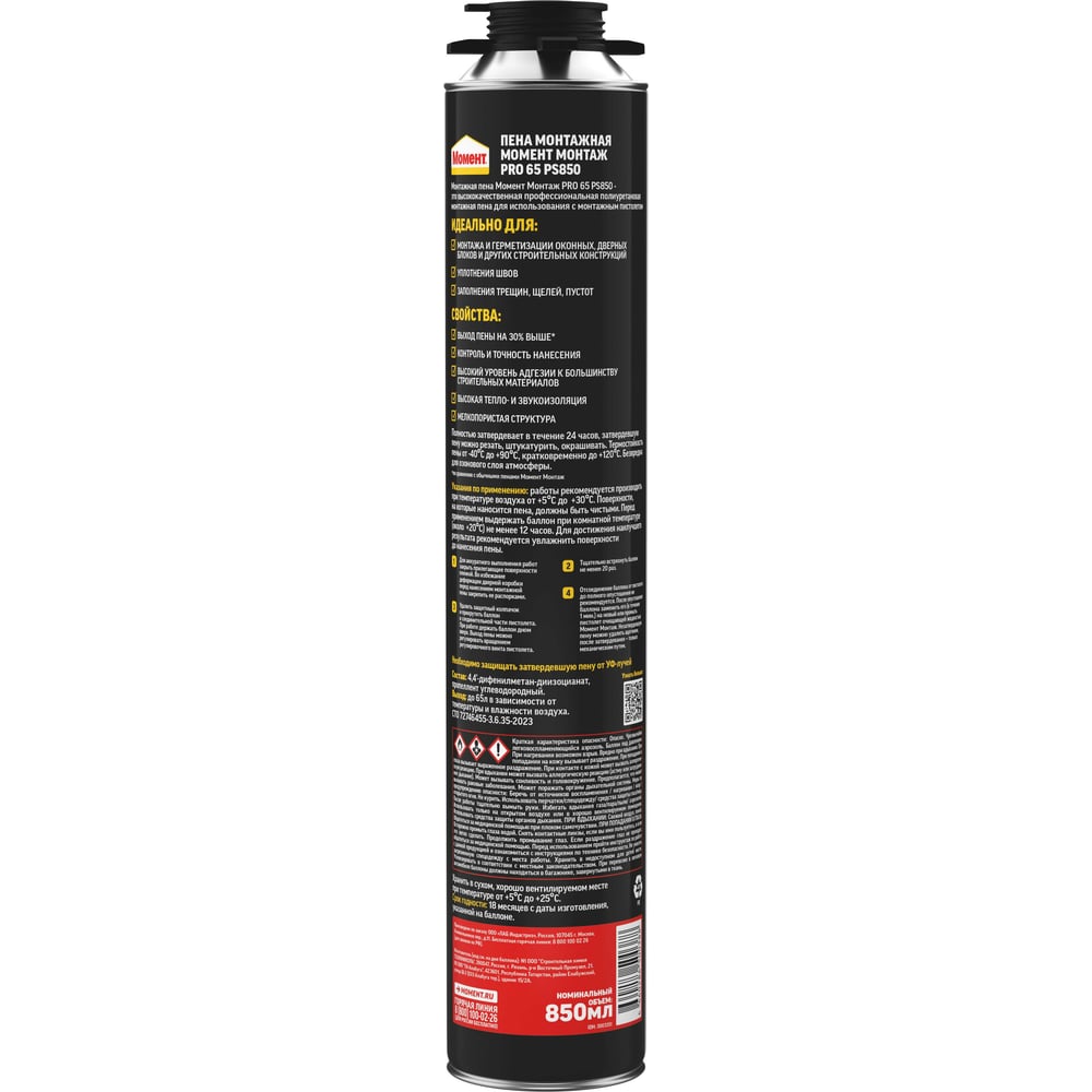 | Объем пены в баллоне (выход) | 65 л |