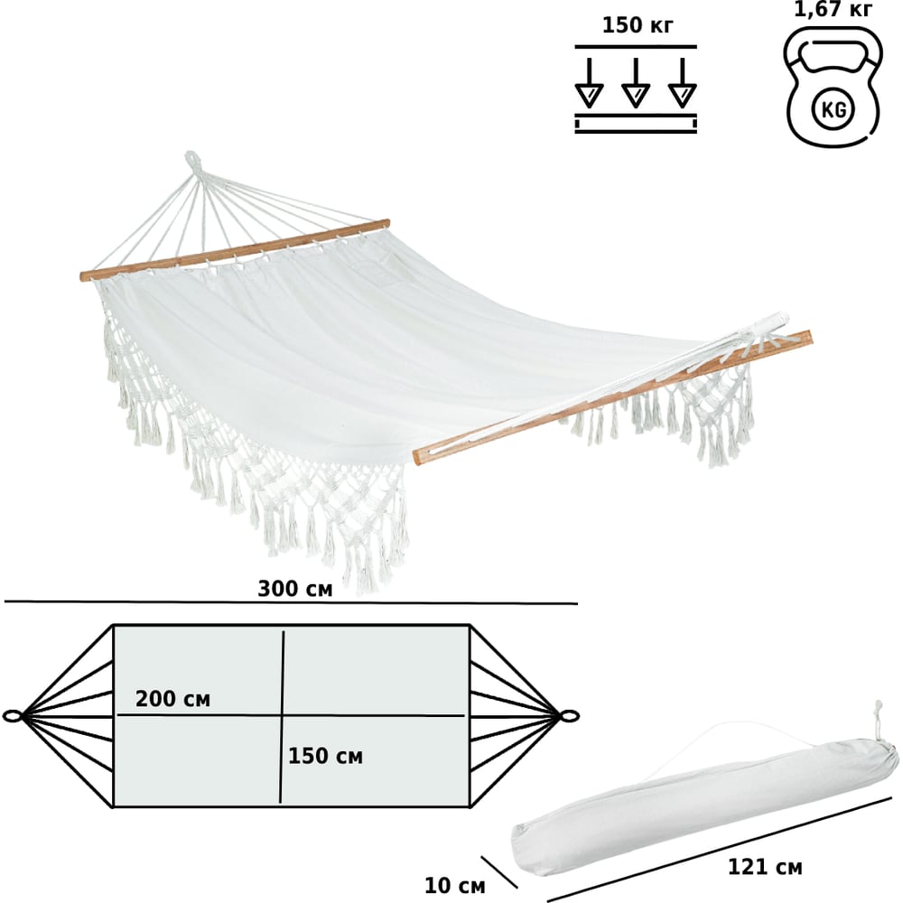 Покрытие нет Цвет белый Вид гамак Вес нетто 14 кг Вид крепления палка для гамака Вместимость 1 Max нагрузка 150 кг Материал полотна поликоттон Водонепроницаемость нет Москитная сетка нет Чехол/сумка в комплекте нет Планка да Каркас нет Ширина полотна 150 см Длина полотна 200 см Тип полотна ткань Материал планки дерево