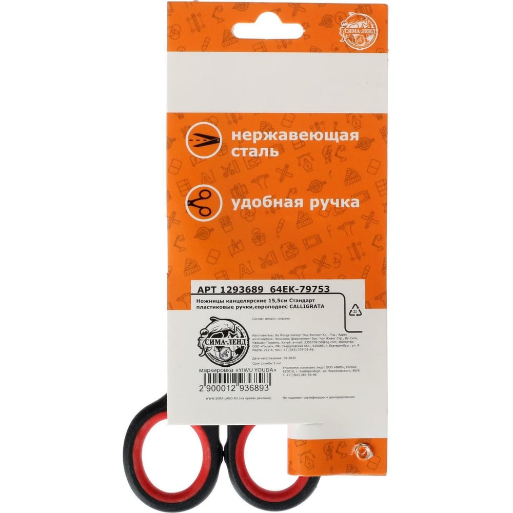 Канцелярские ножницы Calligrata Стандарт 15.5 см пластиковые ручки 1293689