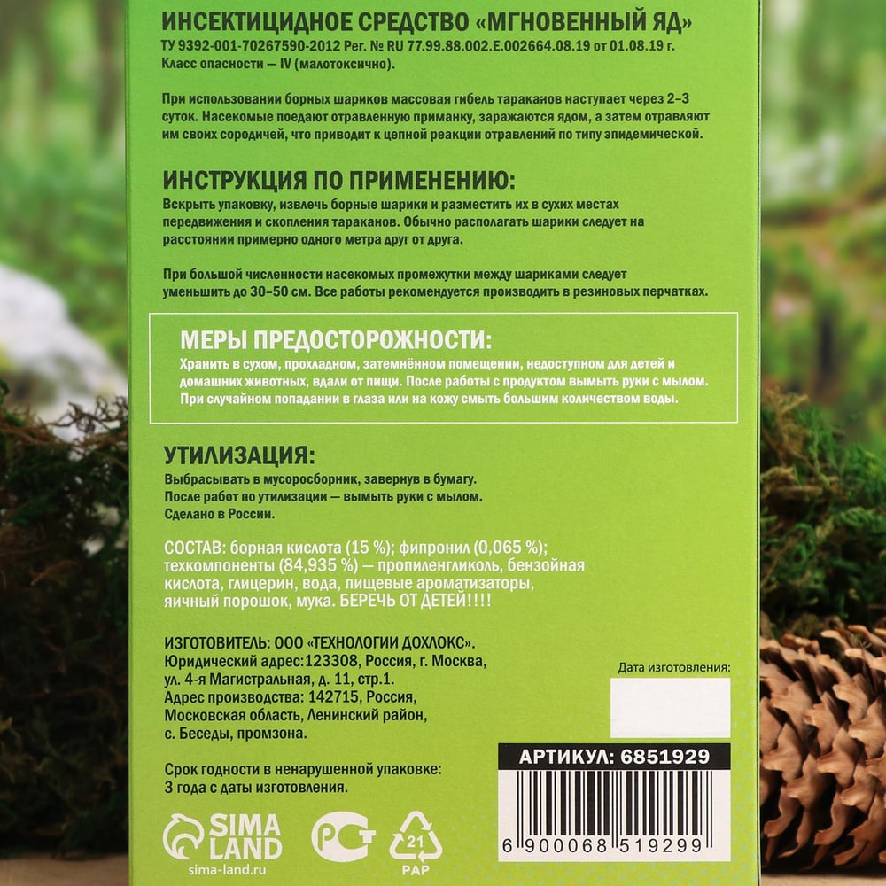 | Состав | фипронил (0.065%), борная кислота (15%), техкомпоненты (84.935%) |
