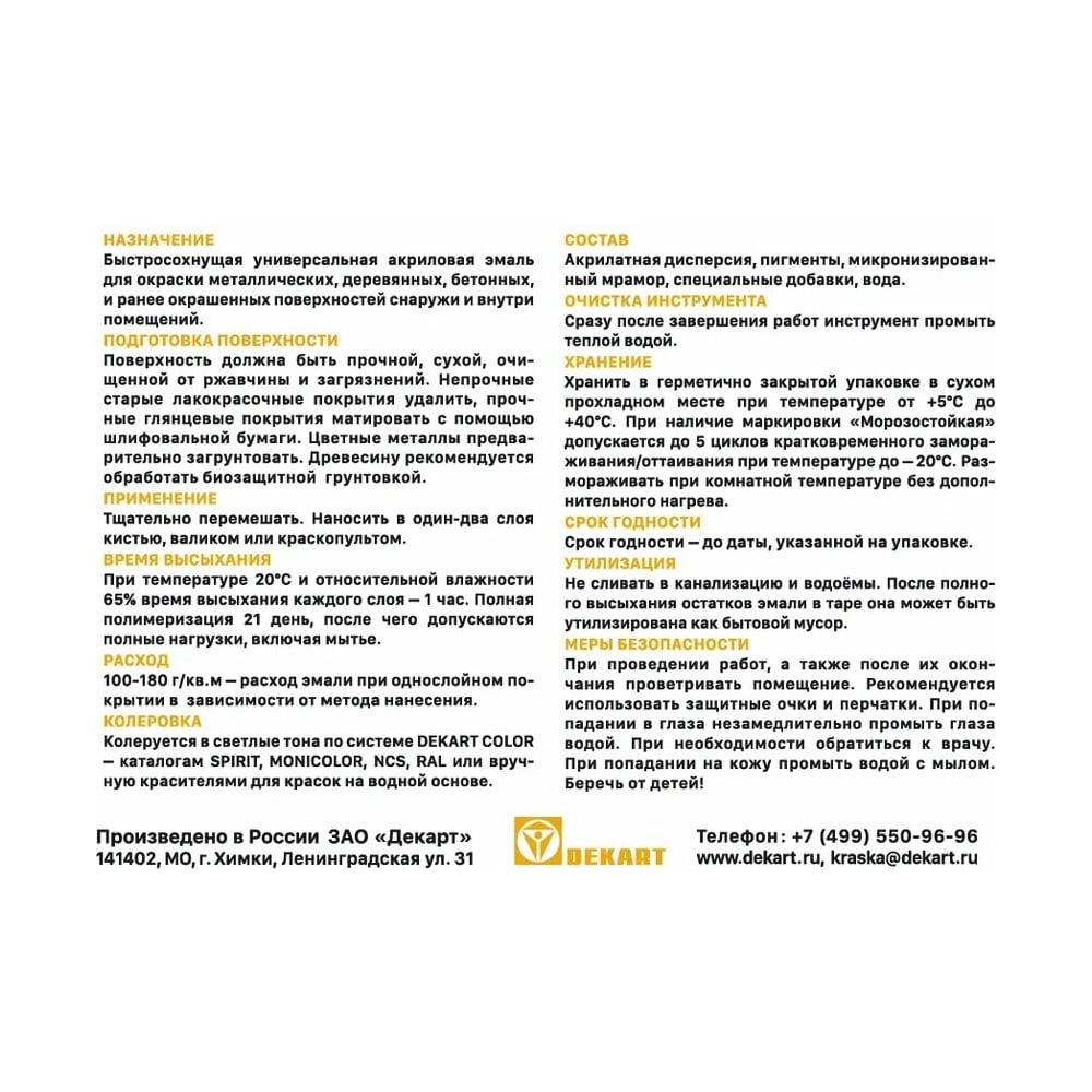 | Система колеровки | Dekart Color — каталогам SPIRIT, MONICOLOR, NCS, RAL |