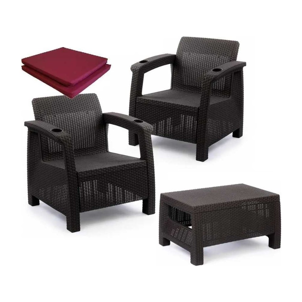 Комплект садовой мебели WORKY набор кофейный на 2 персоны (2 кресла + кофейный столик), искусственный ротанг, с бордовыми подушками ARD258138