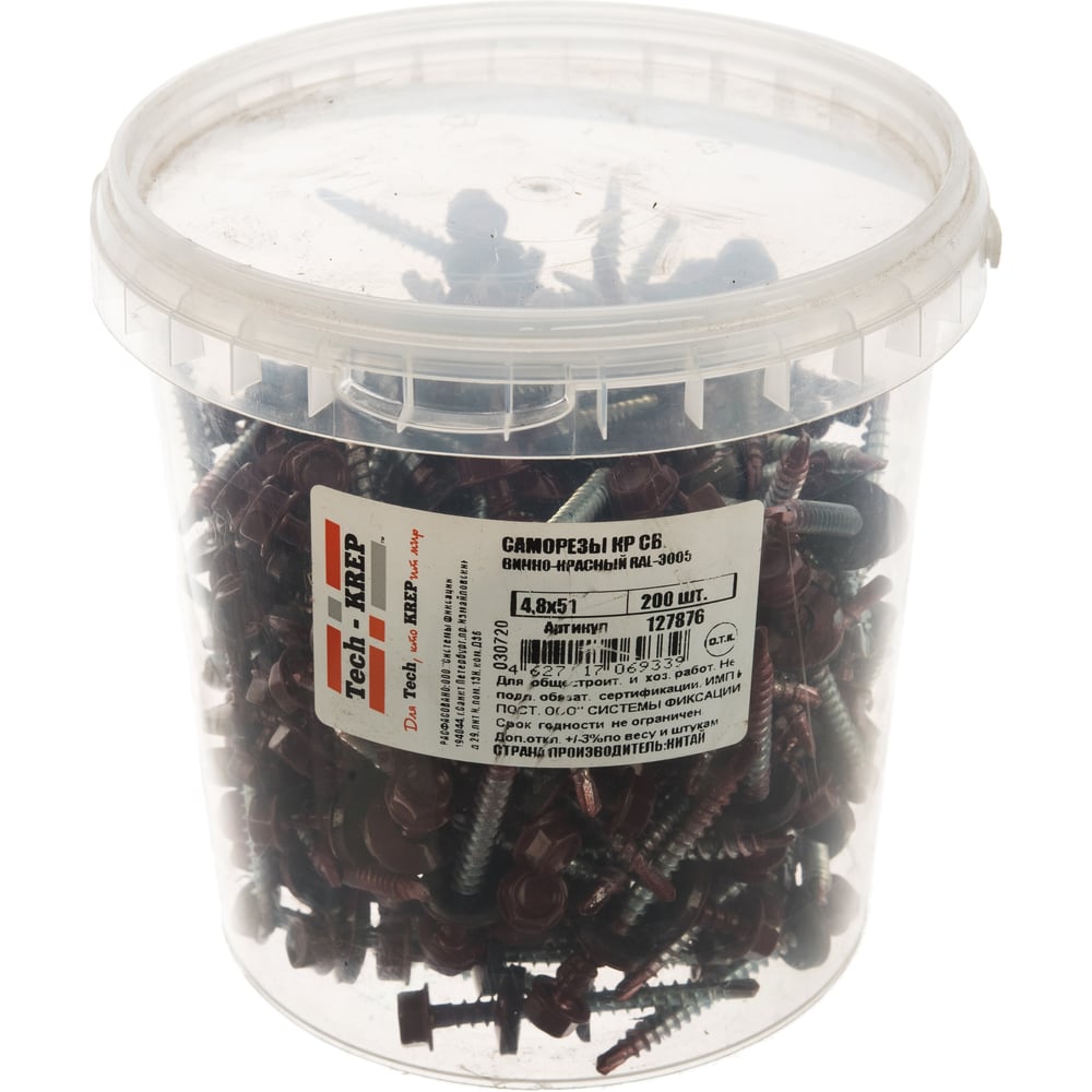 Кровельный саморез Tech-Krep КР сверло 4,8х51 RAL-3005 винно-красный 200 шт, ведро 127876
