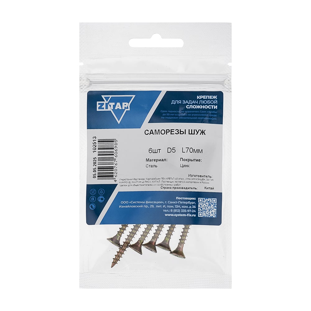 Саморез ШУж с потайной головкой 5,0x70 мм, 6 шт., пакет Zitar 102513