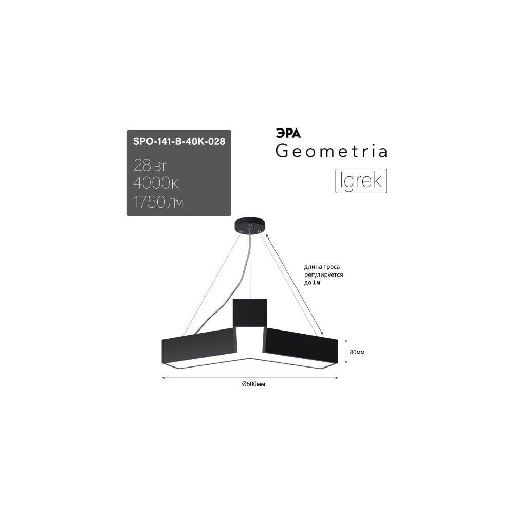 Подвесной светильник LED ЭРА Geometria Igrek SPO141B40K028 28Вт, 4000K 1750Лм, IP40, 600х80, черный, драйвер Б0058883