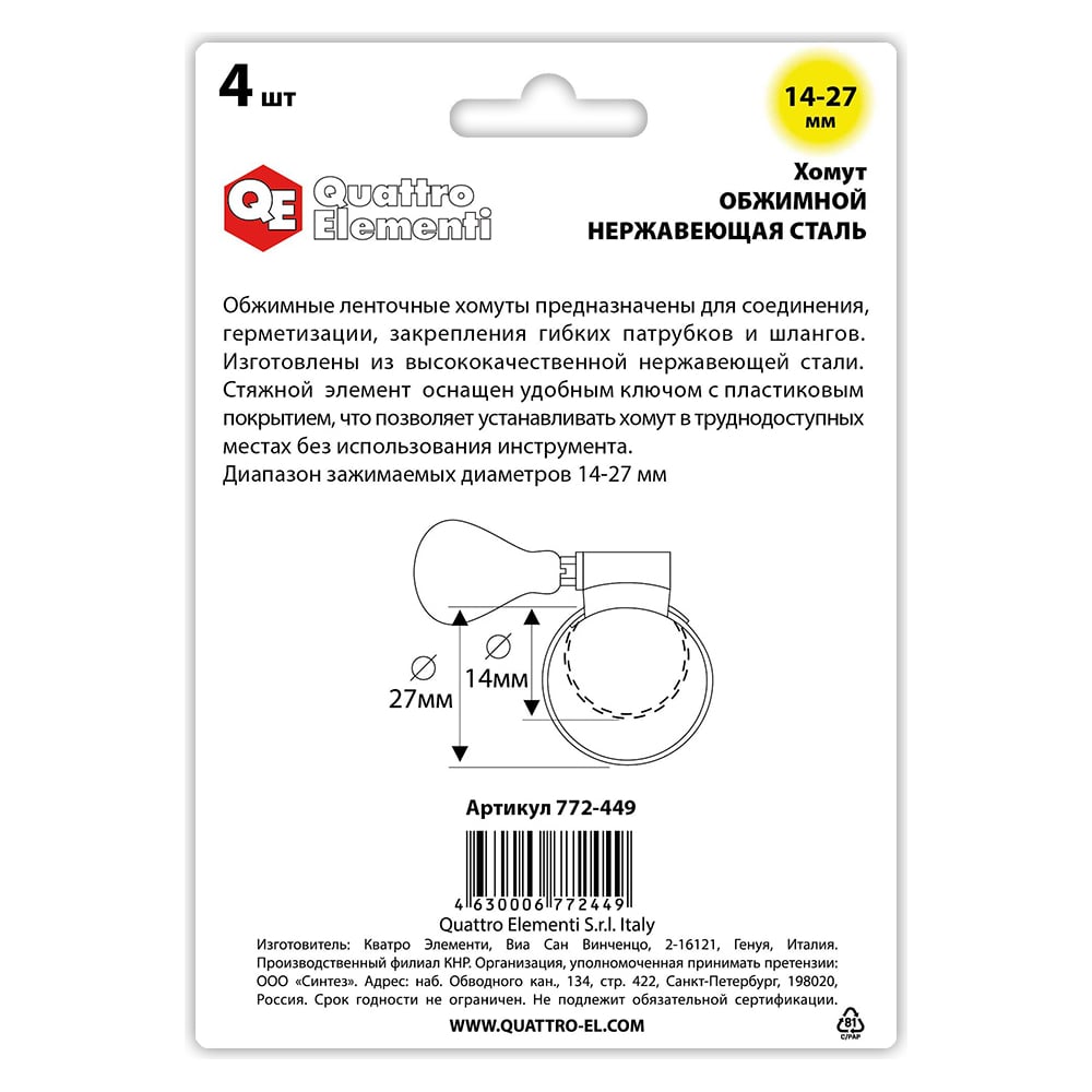 Хомут обжимной QUATTRO ELEMENTI 14-27 мм, нержавеющая сталь, с ключом 4 шт в блистере 772-449
