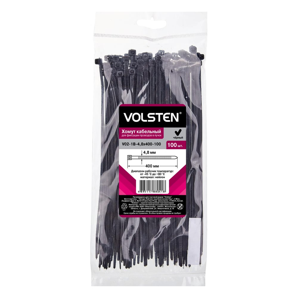 Хомут Volsten V02-1B-4,8х400-100 черный нейлон 4,8х400 100шт. 12966