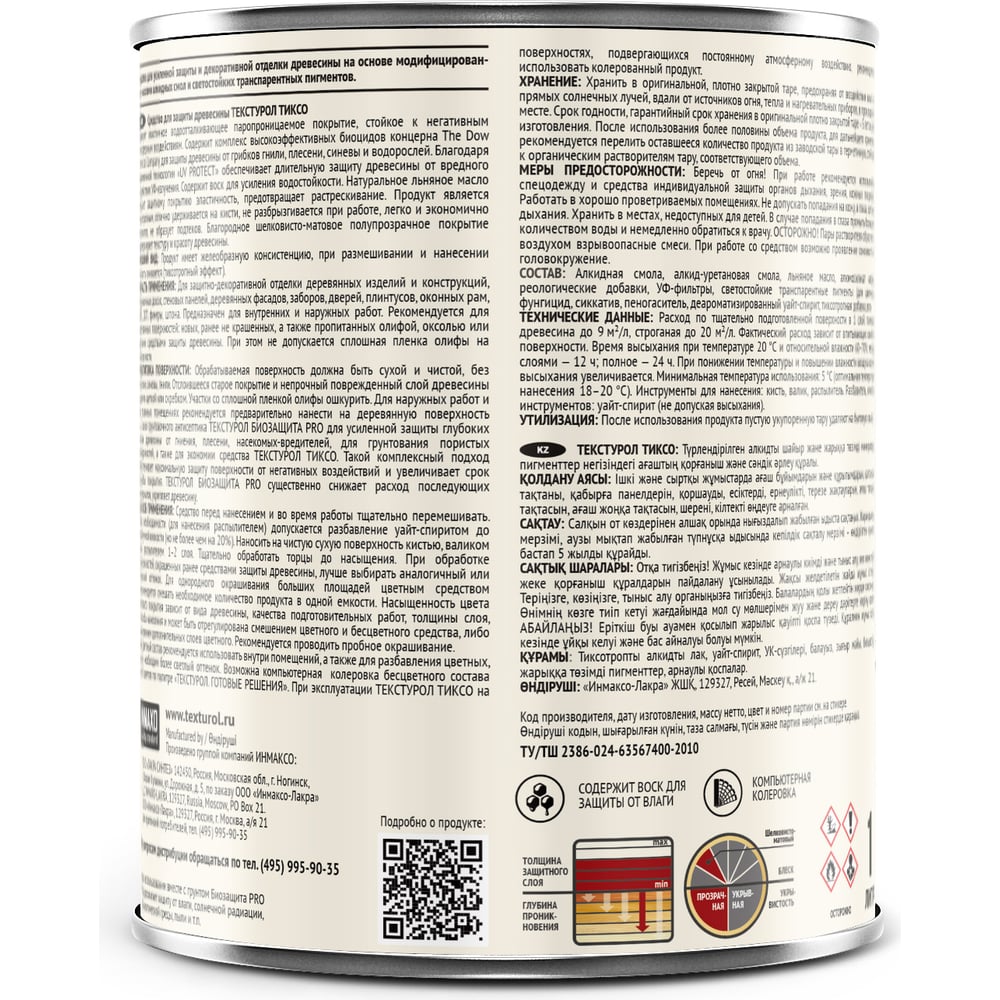 | Состав | Тиксотропный алкидный лак, уайт-спирит, УФ-фильтры, воск, льняное масло, биоциды, светопрочные пигменты, специальные добавки |