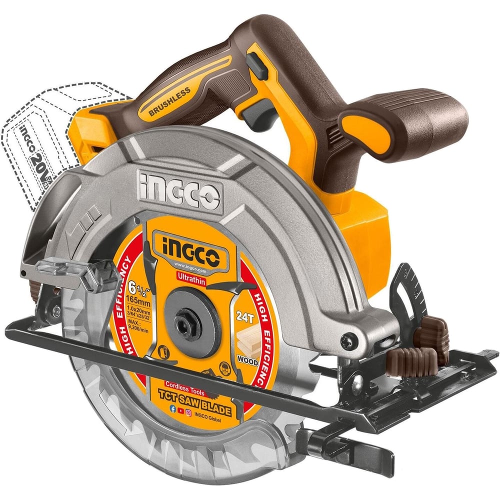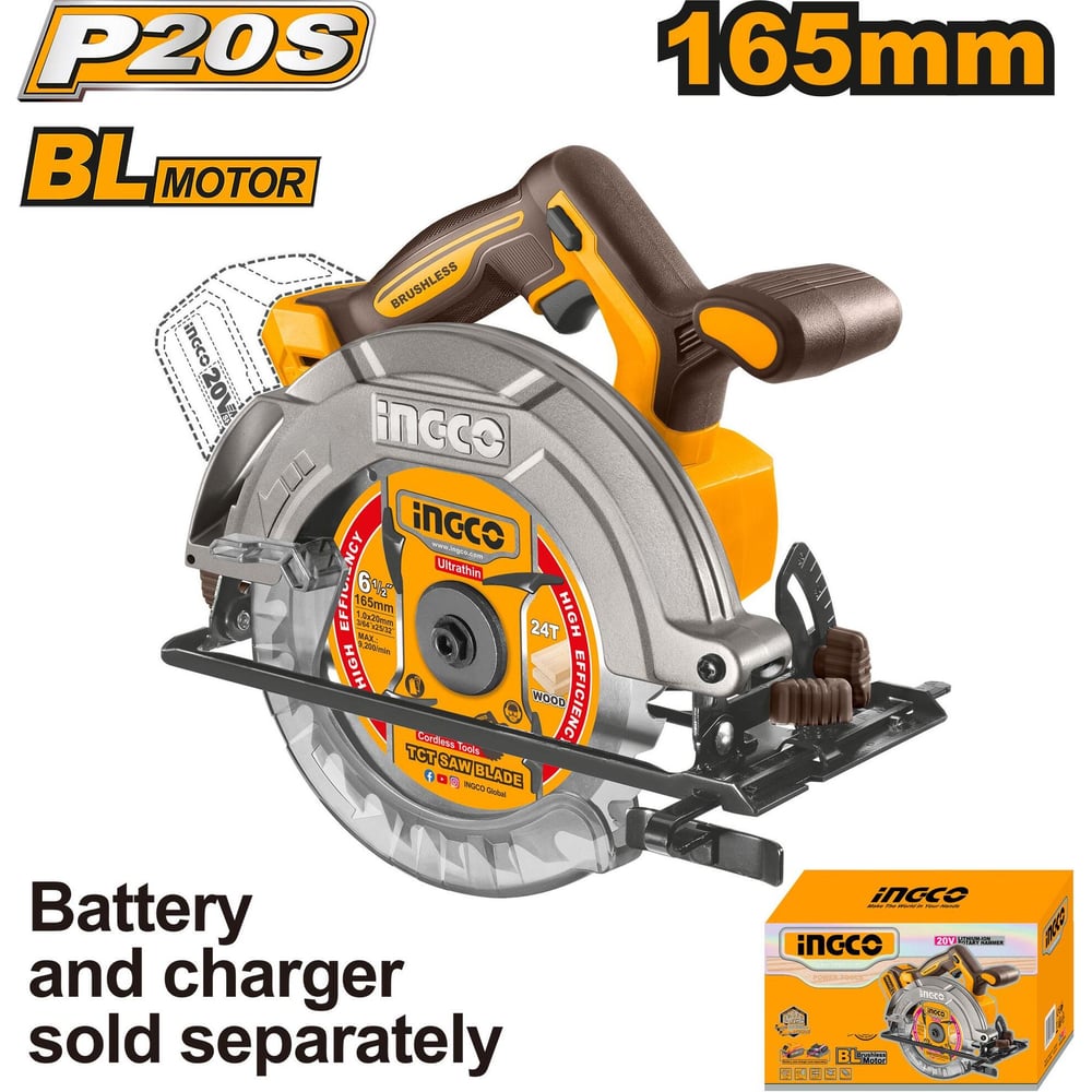 Аккумуляторная циркулярная пила INGCO SUPER INDUSTRIAL BL 20B 165мм, без АКБ и ЗУ CSLI1652