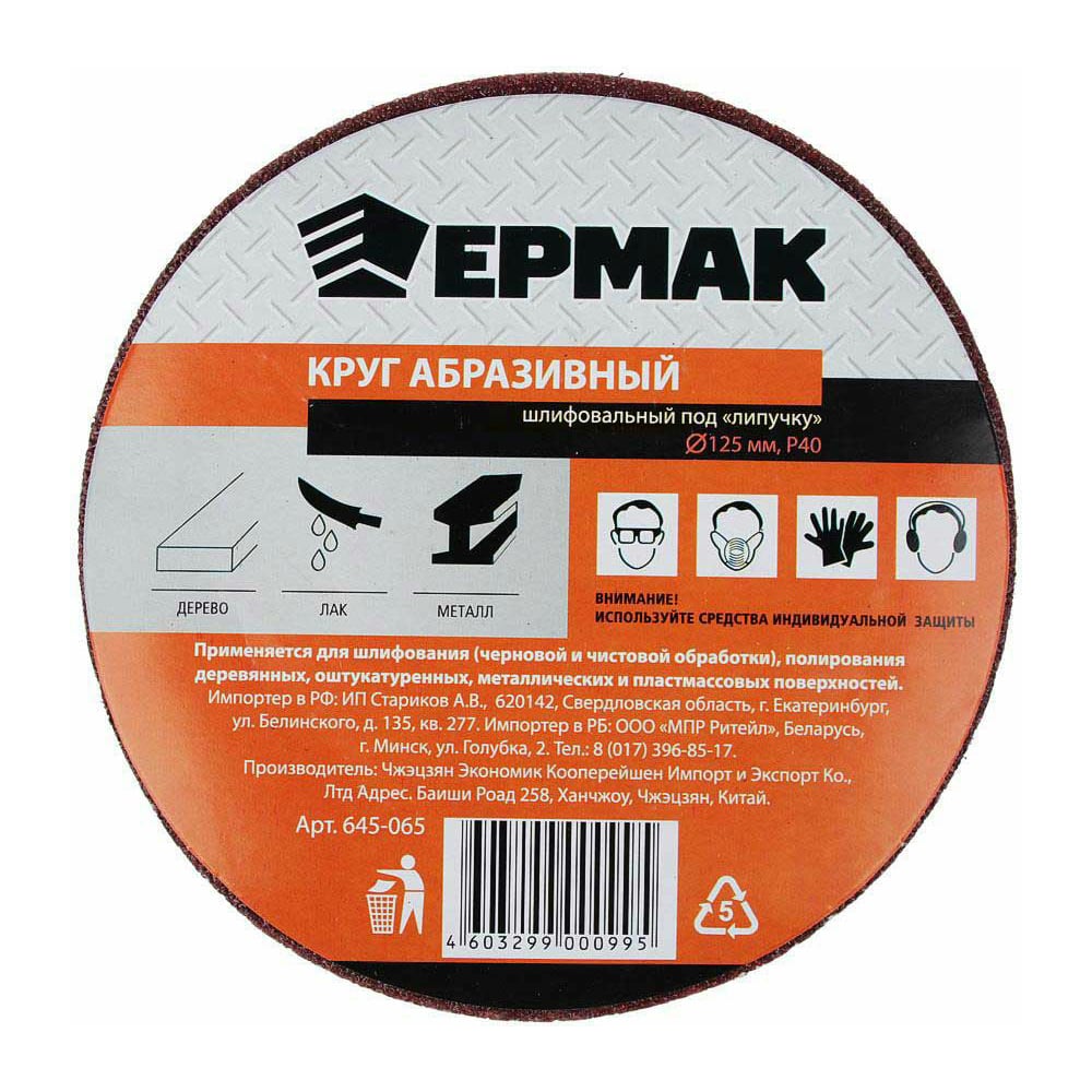 Круг абразивный шлифовальный под липучку (10 шт; 125 мм; Р40) ЕРМАК 645-065