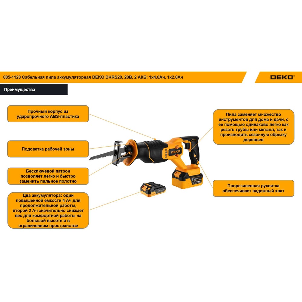 Сабельная пила аккумуляторная DEKO DKHS20 PRO 20В, 2 АКБ: 1x4.0Ач, 1x2.0Ач 085-1128
