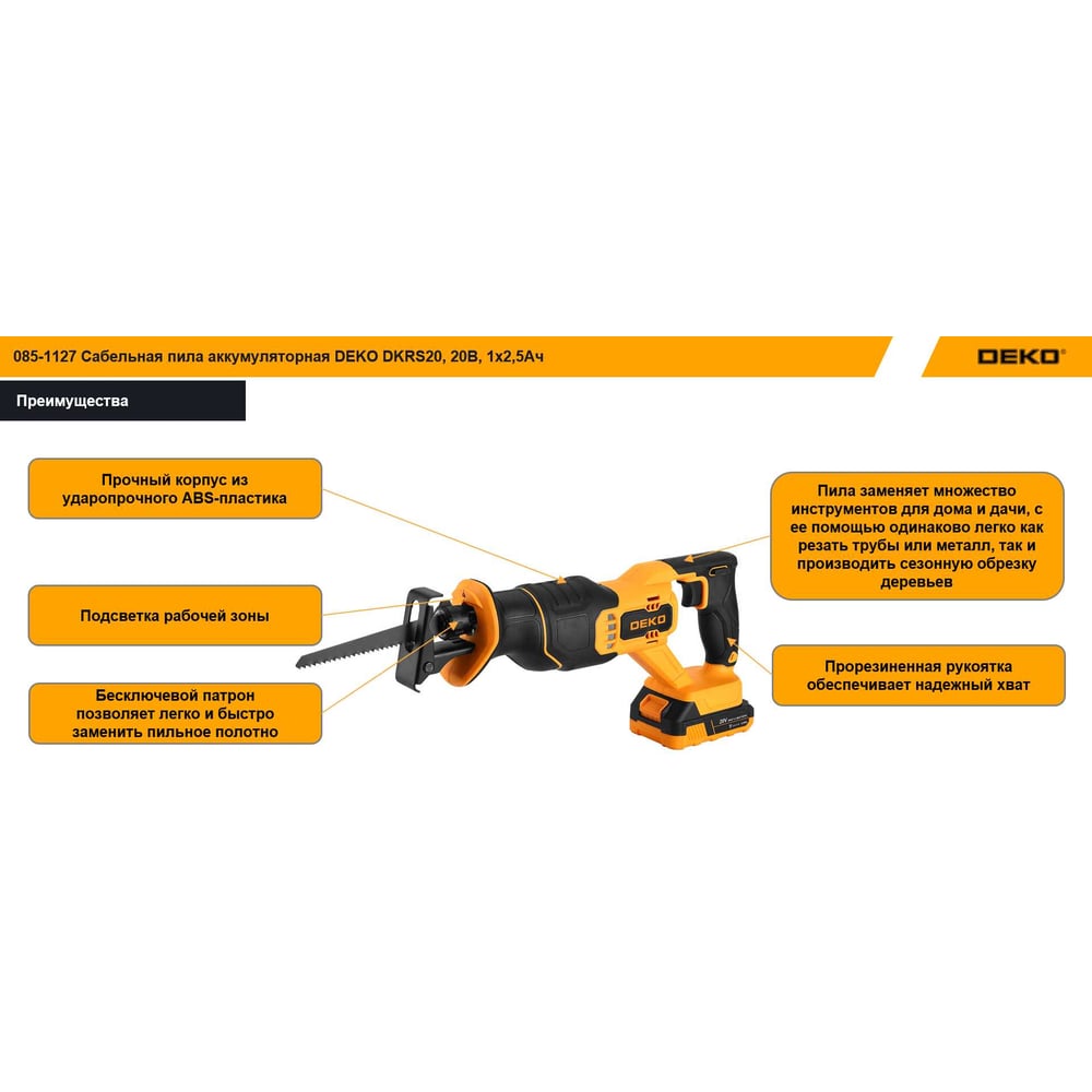 Сабельная пила аккумуляторная DEKO DKHS20, 20В, 1x2,5Ач 085-1127