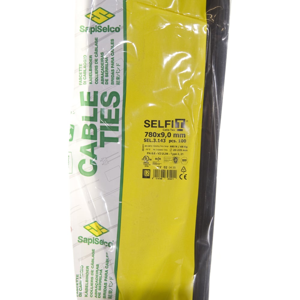 Стяжки черного цвета SapiSelco 9х780 мм, полиамид 6.6, уп. 100 шт. SEL.3.143R