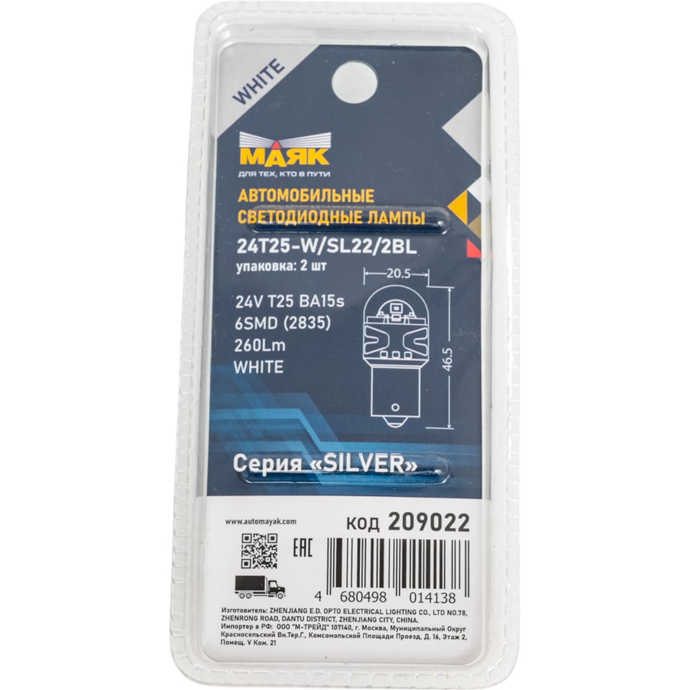 Автомобильная лампа МАЯК SILVER WHITE 24V, T25, 6SMD(2835), BA15s, 2 шт в блистере 24T25-W/SL22/2BL