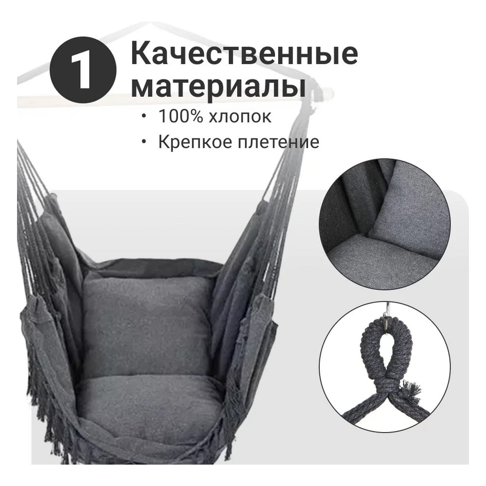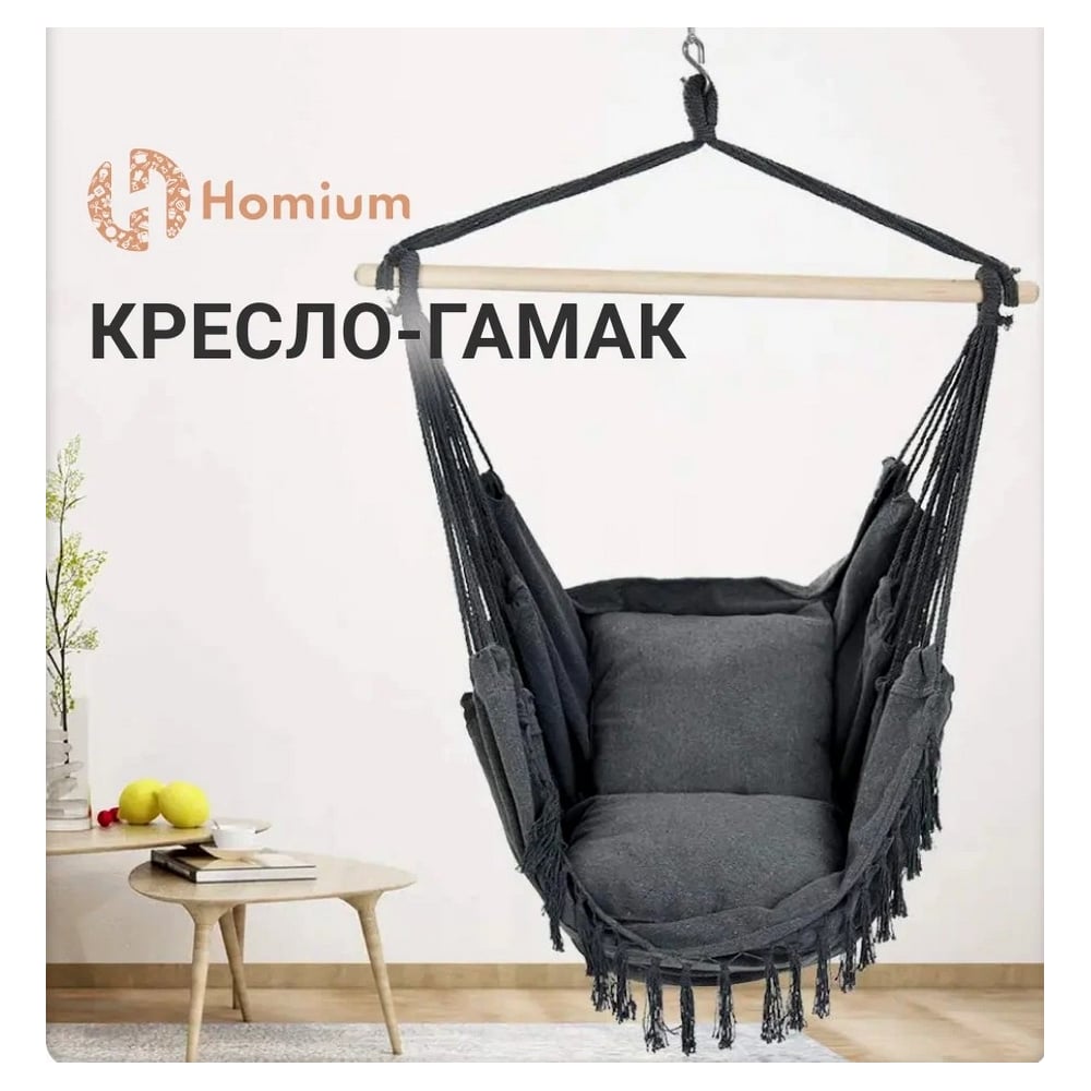 Качели-гамак с 2мя подушками Homium серый, с кисточками (серые подушки, серые нити) hammock3DGrey