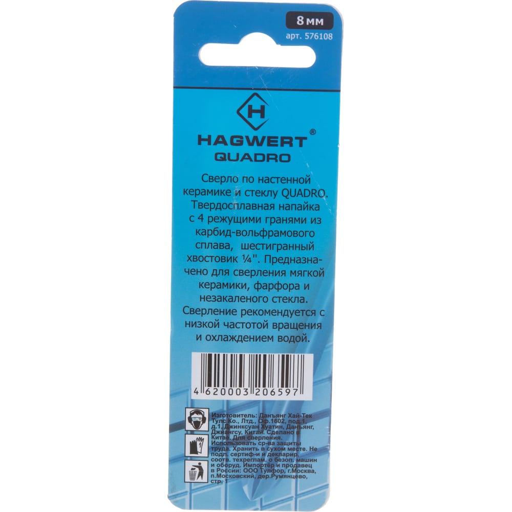 Hagwert сверло по керамике и стеклу 8,0мм 4 грани quadro 576108