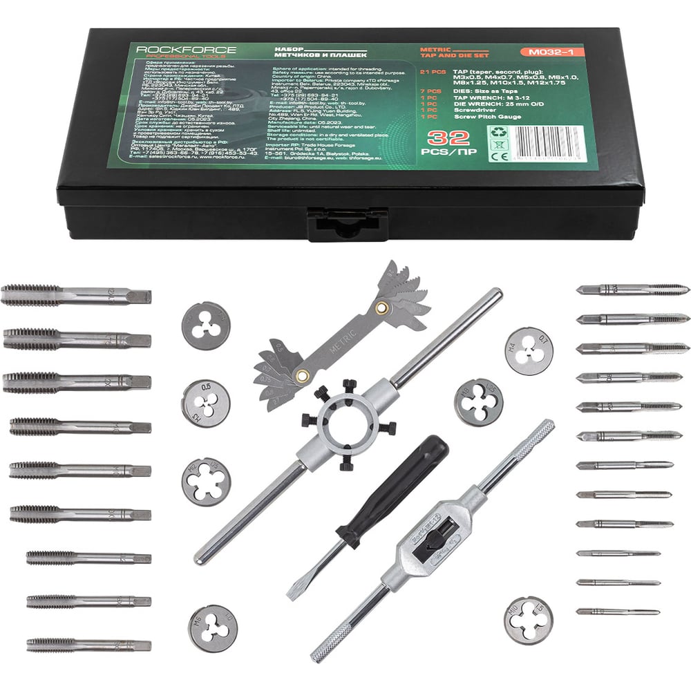 | Комплектация | метчики, плашки, плашкодержатель, метчикодержатель, резьбомер, отвертка |