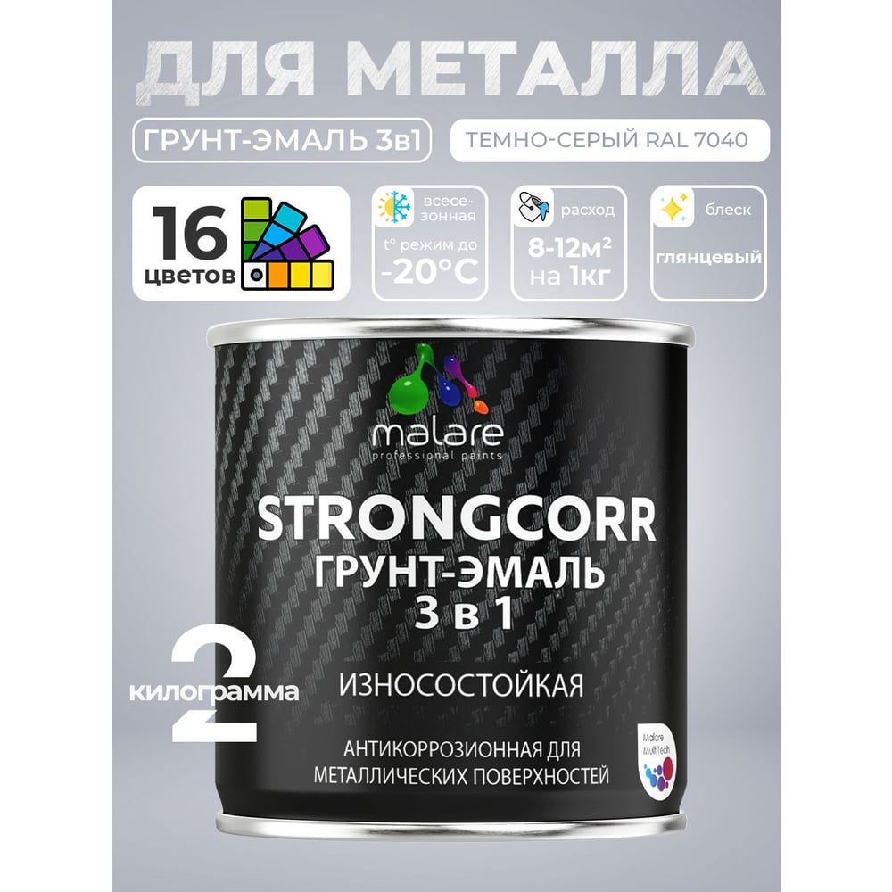 Грунт-Эмаль 3 в 1 по ржавчине MALARE StrongCorr, алкидно-уретановая, глянцевая, темно-серый, 2 кг 7930085243593 ГЭСТР7040Г0200