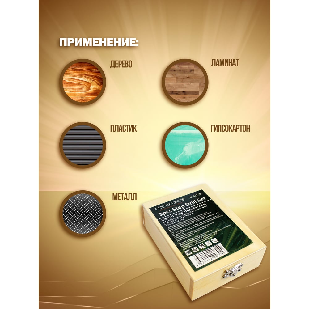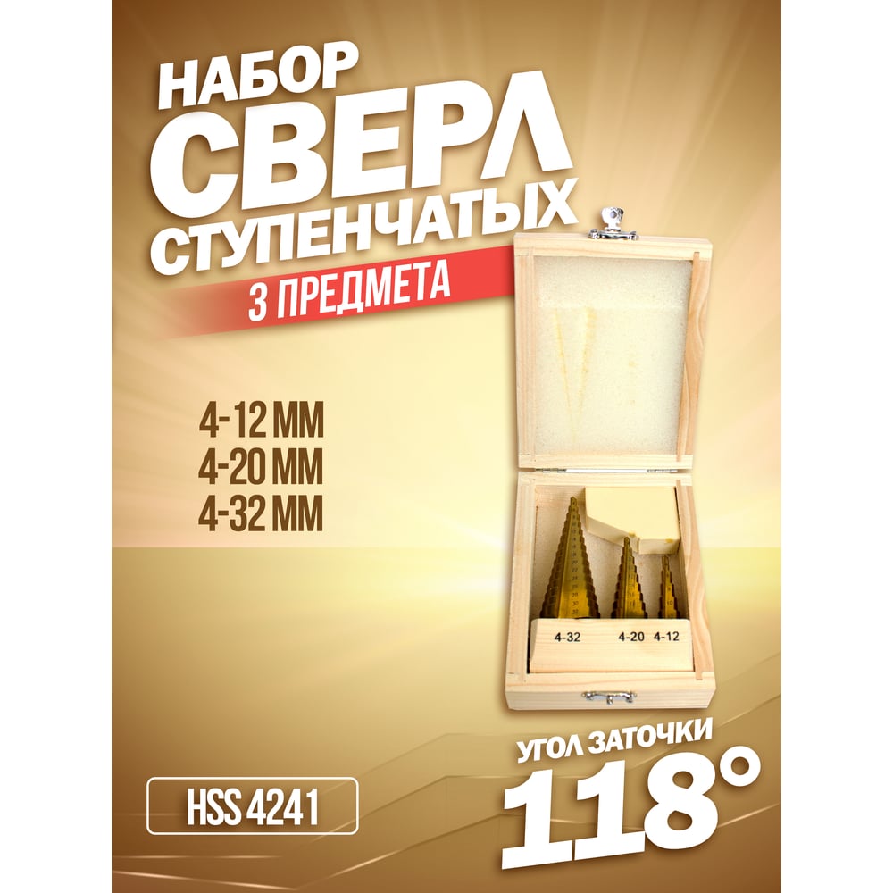 Набор сверл ступенчатых 3 шт, 4-12/4-20/4-32 мм, в кейсе ROCKFORCE RF-44730(48682)