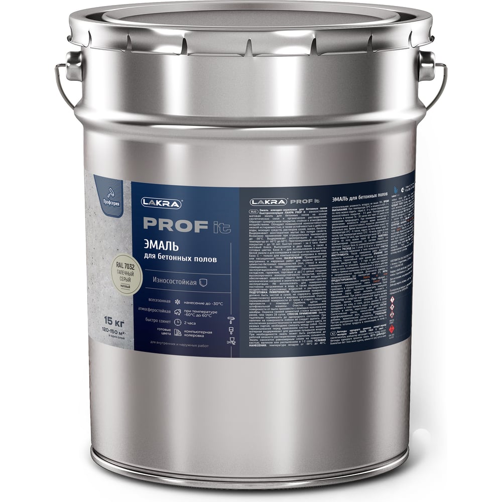 Эмаль для бетонных полов ЛАКРА Prof it быстросохнущая, галечный серый, ral 7032, 15 кг 8311362 ЛА-00001582